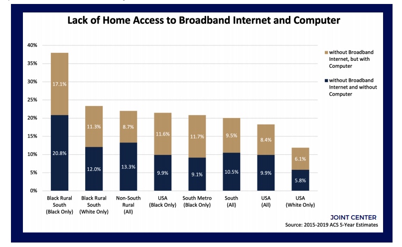 As Dr. Dominique Harrison, the Joint Center's technology policy director, writes, "More than almost any other group, Black communities in the Rural South lack affordable, highspeed, quality broadband—38 percent of African Americans there report they do not have access to home internet. This is driven by both the lack of affordability and availability of broadband services. Expanding broadband could help reduce the deep racial and economic inequalities in education, jobs, and health care in the region."