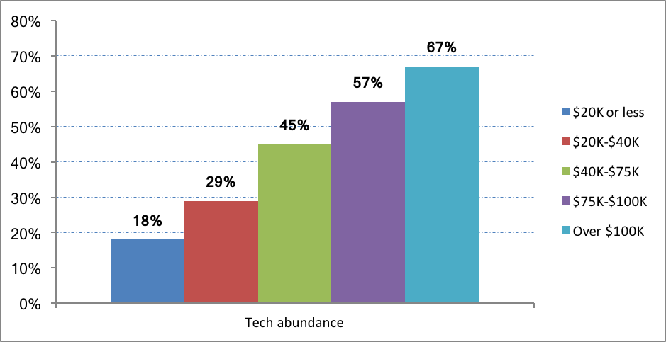 Tech abundance is not distributed evenly throughout society, especially when looking at adoption by income. Two-thirds (67%) of upper income Americans have a smartphone, broadband, and a tablet. For lower-income America, tech abundance is a rarity, with fewer than one in five (18%) having all of these tools.